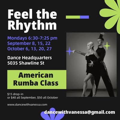 Mondays from 6:30—7:25 pm at Dance Headquarters, 5035 Shawline St. Drop-in for $15 per class, or $50 for the month up front. See how a smaller group class with more individual attention can take your dancing to another level! Whether you are a beginner or intermediate dancer, this class will help you with the technique you need to be an excellent leader or follower. Using basic patterns of American Rumba to teach essential skills then moving on to intermediate patterns as the class progresses.