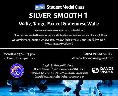 Mondays from 7:30—8:25 pm at Dance Headquarters, 5035 Shawline St. Drop-in for $15 per class, or $50 for the month up front. We study the Smooth dances (Waltz, Foxtrot, Tango, Viennese Waltz) through the structure of the Dance Vision student medal system. Now starting Silver level 1!